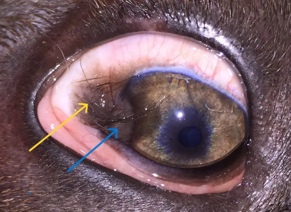 Dermoids may appear as whitish, pale pink, or even light brown in colour and often with hairs growing from the surface towards the cornea. Although they can cause irritation, discomfort, and reduced vision, they do not necessarily pose significant health risks. Surgical repair of eyelid agenesis or dermoids can be performed when the patient is old enough for safe general anesthesia; until then, application of a lubricant to protect the cornea against trichiasis is recommended.