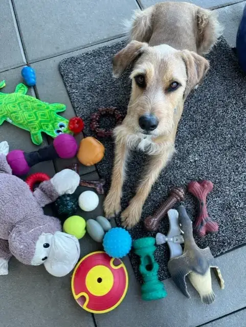 Keep up the great work, and you can start brushing his teeth in two weeks. If you can figure out what Toby broke his tooth on, get rid of it, and avoid bones and really hard chew toys. Otherwise, he can have his toys back in about 10 days.”